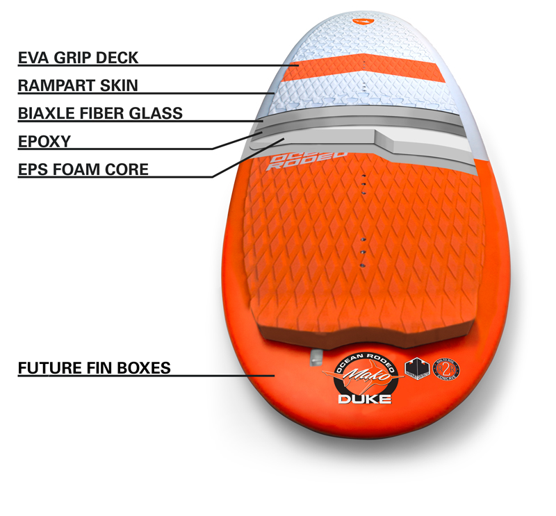 The Duke can be setup with 3 distinct fin setups, each give the board a unique character. In tri fin mode ( one center fin, two side fin near the tail) the Duke becomes a flat water chop strapless freestyle machine making sliding moves and reverse landings easy. For more bite, move the side fins up one for true thruster setup, snappy pivot turns on the wave face. When the conditions are really good, we like to crank up the fin count with the quad set up. The Duke in quad mode is a pure delight for the dedicated wave rider, fast down the line allowing deep hard driving carves. The quad fins also get you back up wind faster, letting you ride the board flat and fast while you search for the next bomb.